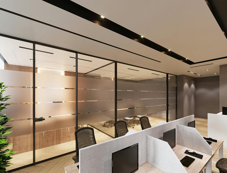 Glass partitions create a modern, open look while neatly dividing spaces. They allow natural light to flow through and are ideal for offices and interiors requiring a clean, professional finish.